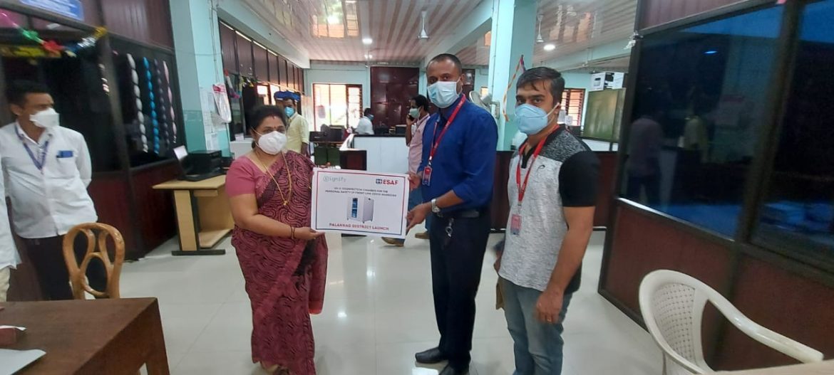 പാലക്കാട്: ഇസാഫ് പ്രമുഖ ലൈറ്റിംഗ് കമ്പനി സിഗ്നിഫൈ ഇന്ത്യ ലിമിറ്റഡുമായിച്ചേർന്ന് കോവിഡ് പ്രതിരോധത്തിന്റെ ഭാഗമായി കേരളത്തിലെ വിവിധ ആശുപത്രികൾക്ക് യു വി ഡിസ്ഇൻഫെക്ഷൻ ചേംബറുകൾ വിതരണം ചെയ്യും. ജില്ലയിലെ 13 ആശുപത്രികള്ക്കായി 19 ഡിസ്ഇന്ഫെക്ഷന് ചേംബറുകളാണ് നല്കുന്നത്.